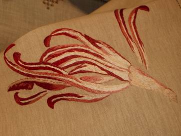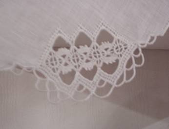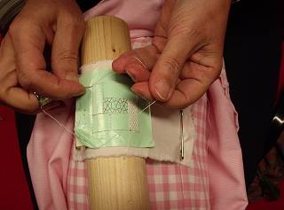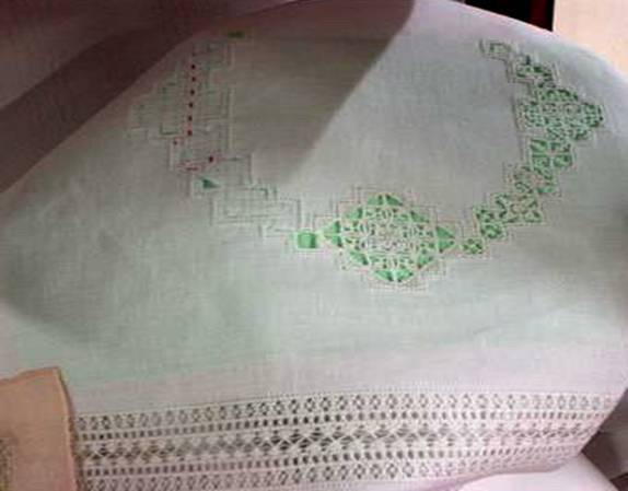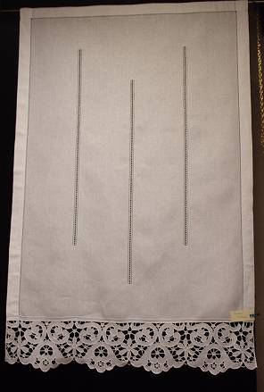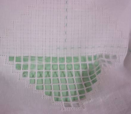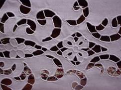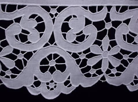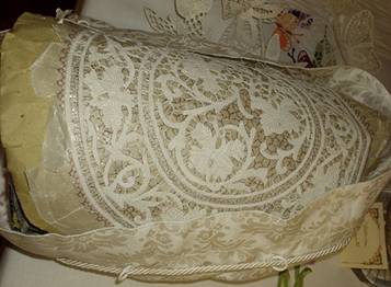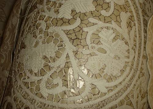 Merletto ad ago di Burano durante la lavorazione, le mani che lavorano sono di