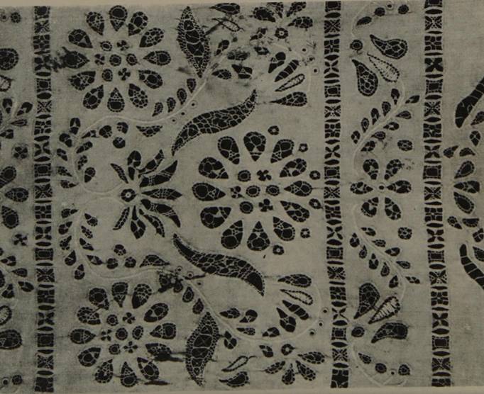 associa questo pizzo ad alcuni ornamenti indo-persiani. Anche in questo caso troviamo dei vuoti al centro delle foglie e dei fiori, riempiti