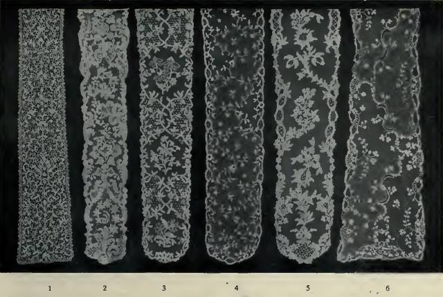 Sei tipi di barbole realizzate ad ago: 1 Venezia punto rosa, 2 punto inglese, 3 Argentan, 4 punto inglese, 5 punto Burano, 6 Alençon