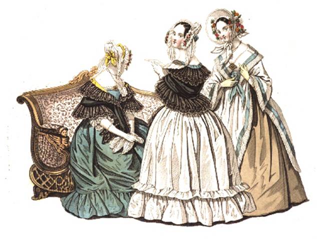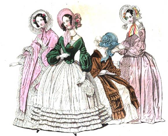 da passeggio abbinati agli scialli, uno è in un pregevole tessuto tutto ricamato, l’altro è in merletto con punte arrotondate. Acquerello di David Jules, 1852, Museo Palais Galliera,