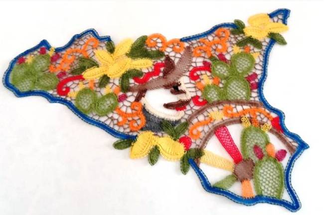 merletto che raffigura la Sicilia con i simboli dell’arte e dei prodotti