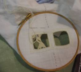 sfondo tendaggi lavorati a mano con lavorazione ad intaglio ed intarsi a filet, in primo piano merletti
